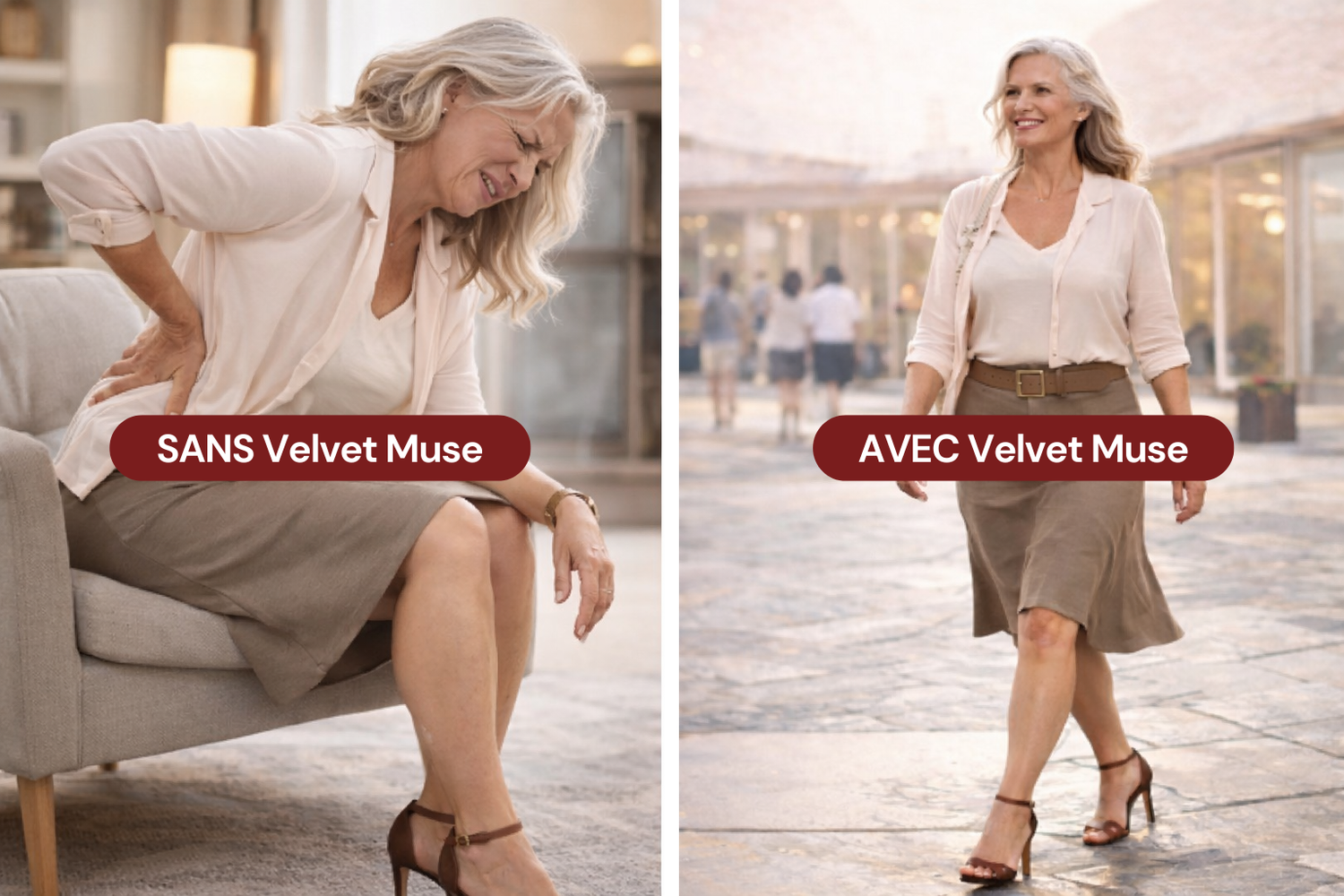 Avec Velvet Muse, bougez sans crainte. Le pied est mieux soutenu, le corps reste droit et la marche devient plus stable et naturelle.